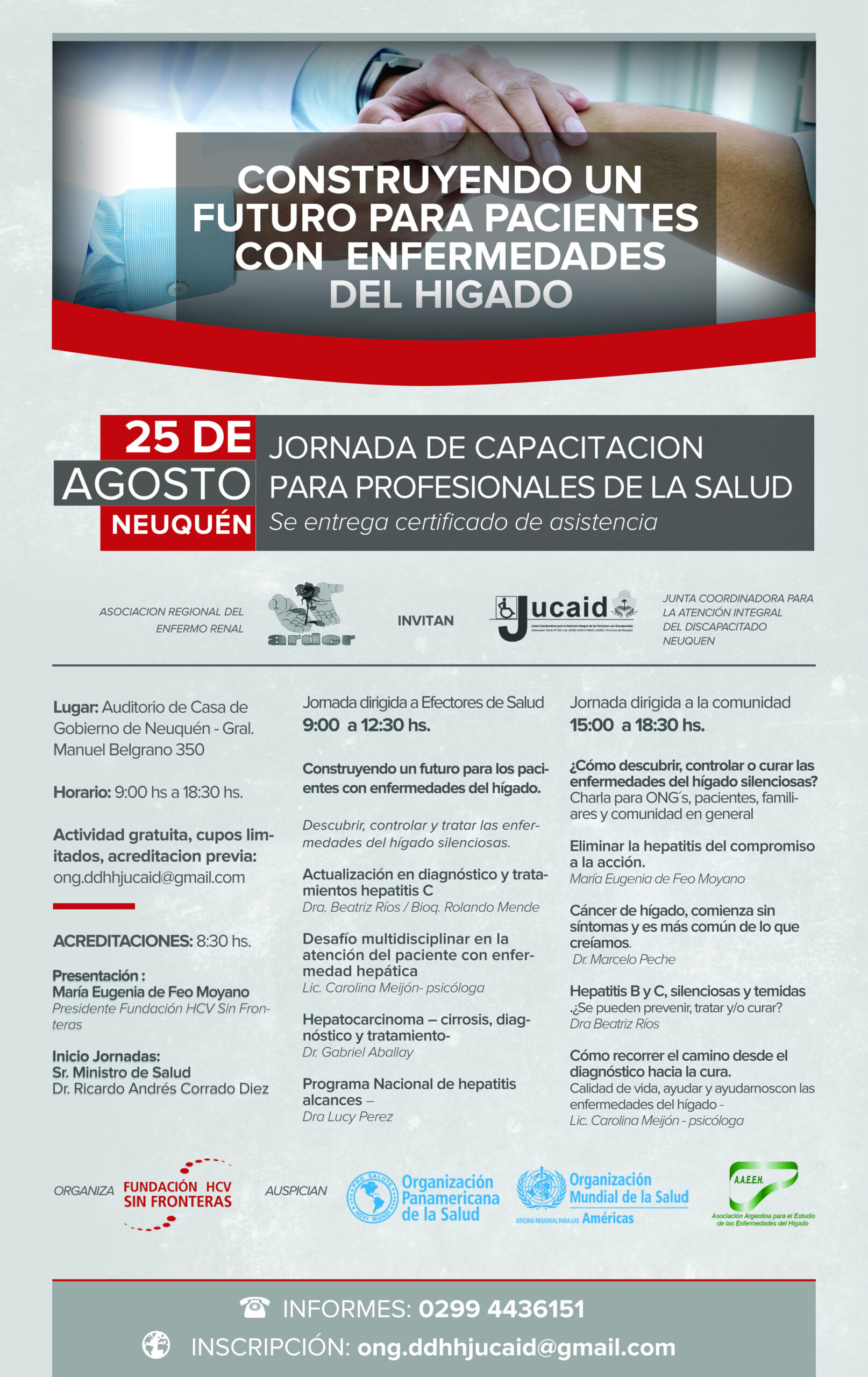 El 25 de agosto se realizará en Neuquén una Jornada para la salud hepática, con el auspicio de la Organización Panamericana de la Salud y la Asociación Argentina para el estudio de las enfermedades del hígado y la organización de Fundación HCV Sin Fronteras, Asociación Regional del Enfermo Renal y Jucaid Neuquén.
