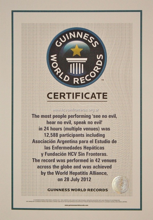 Buenos Aires – 31/10/2012 | La Fundación HCV Sin Fronteras de Argentina, miembro pleno de la Alianza Mundial Contra la Hepatitis (WHA por su sigla en inglés), tiene el agrado de anunciar que el intento de record Guinness que tuvo lugar el Día Mundial de la Hepatitis (28 de julio) y en el que participaron 12.588 personas de todo el mundo, ha sido exitoso dando lugar a un nuevo record mundial. HCV Sin Fronteras recibió el pasado 28 de octubre los certificados oficiales que otorga Guinness a los ganadores.