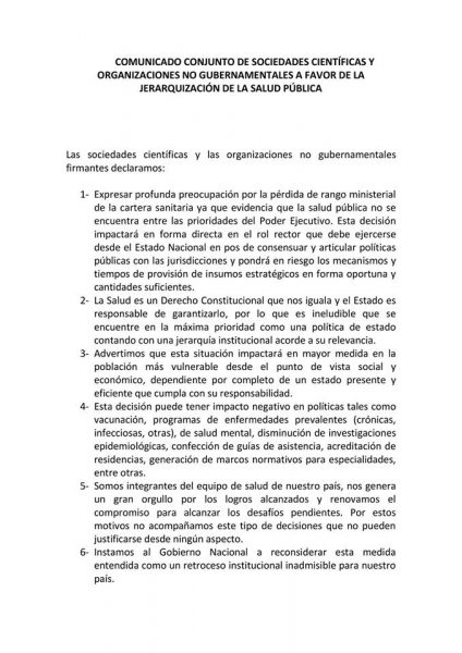 Expresamos nuestra profunda preocupación ante los anuncios gubernamentales sobre la desjerarquización del Ministerio de Salud que se transformará en Secretaría de Salud. Esto implica que se reduce su autonomía funcional, presupuestaria, se restringe también su libertad de planificación, y confección de políticas públicas en relación con jurisdicciones provinciales.