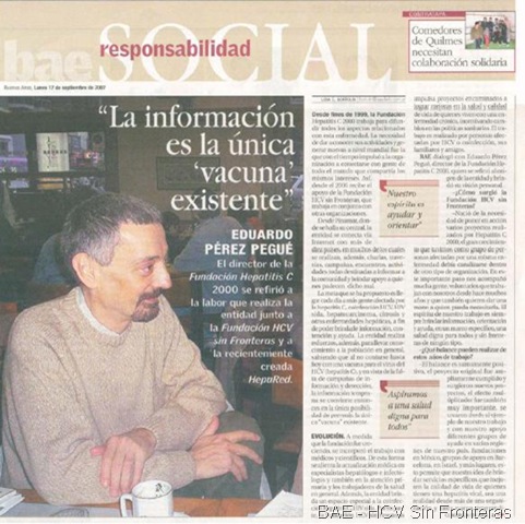 Muy buena nota en el periódico Buenos Aires Económico BAE de Argentina, sobre Hepatitis C 2000 y la Fundación HCV Sin Fronteras, detallando también la tarea de HepaRed.