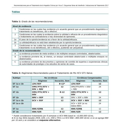 Las recomendaciones para tratamientos para hepatitis C libres de Interferón, están orientadas de acuerdo a la disponibilidad de drogas en el país en la actualidad. Sin embargo advierten que estas guías seguirán actualizándose en un futuro cercano debido a la rapidez de los avances científicos en busca de mejoras de tratamientos y diagnósticos para esta enfermedad.