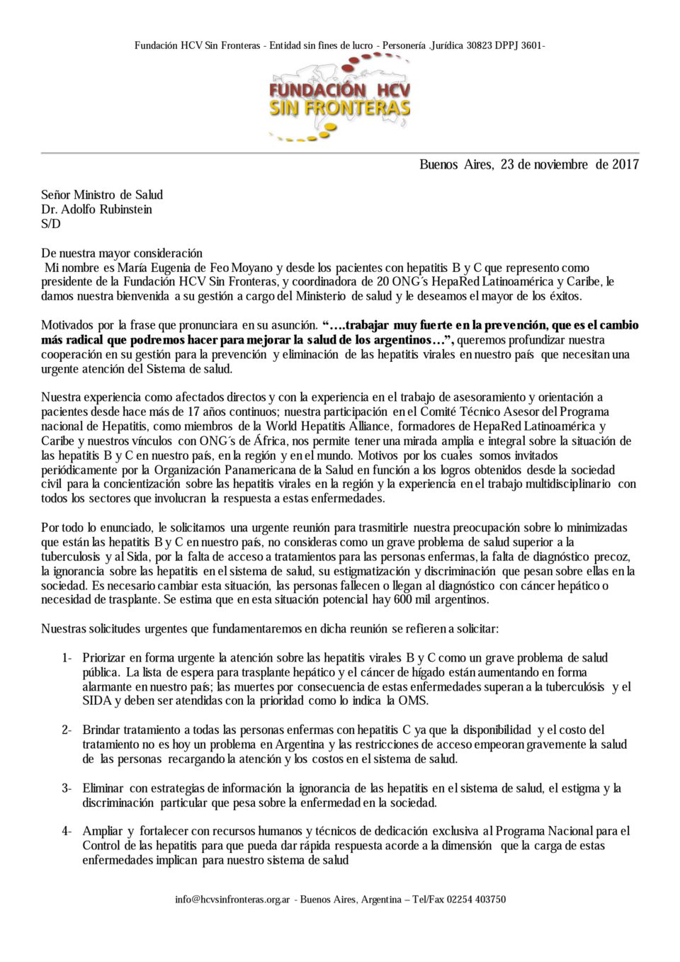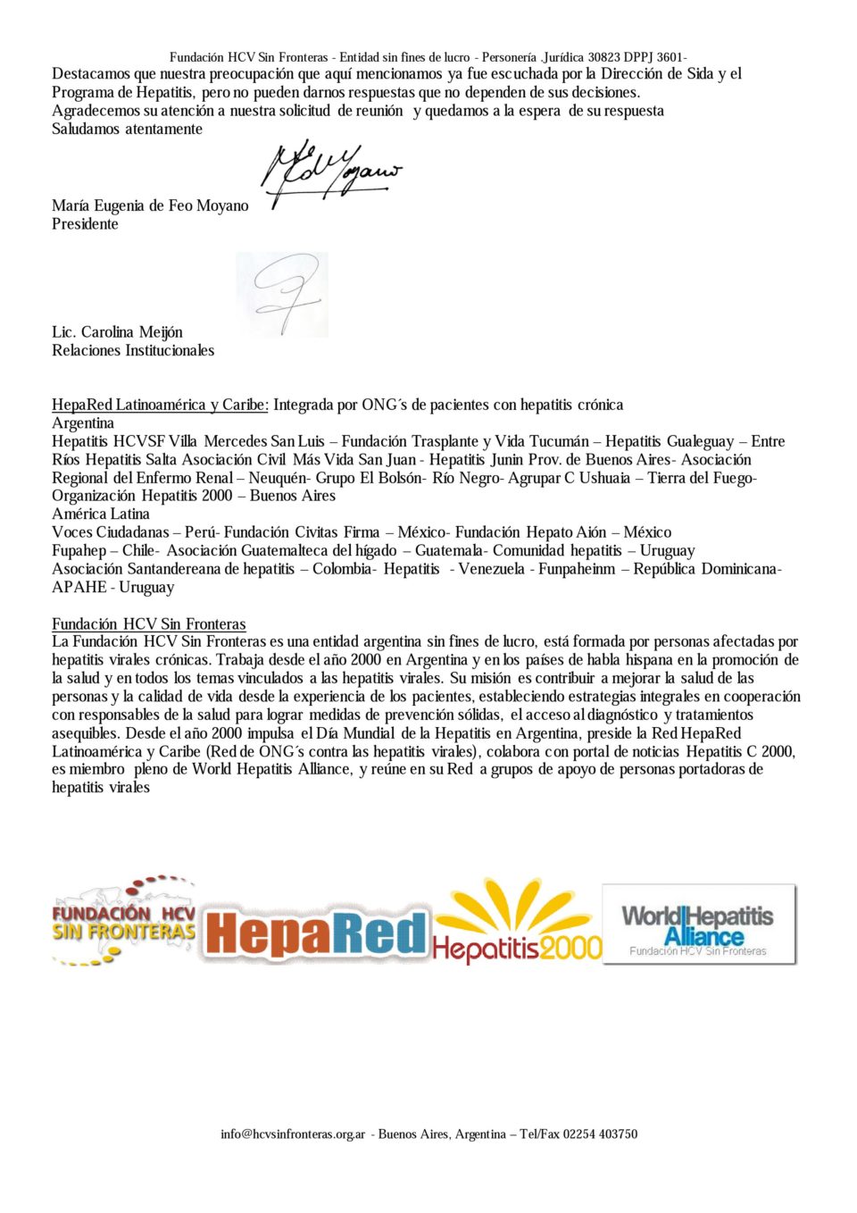 Ofrecemos como siempre al Sr. Ministro, la cooperación de Fundación HCV Sin Fronteras, Hepatitis 2000 y HepaRed Latinoamérica y Caribe, sociedad civil de hepatitis con 17 años continuos de trayectoria en Argentina, América y África, con una amplia mirada sobre la carga para la salud de toda la sociedad que implican las hepatitis virales