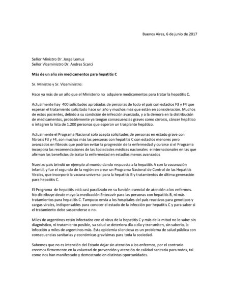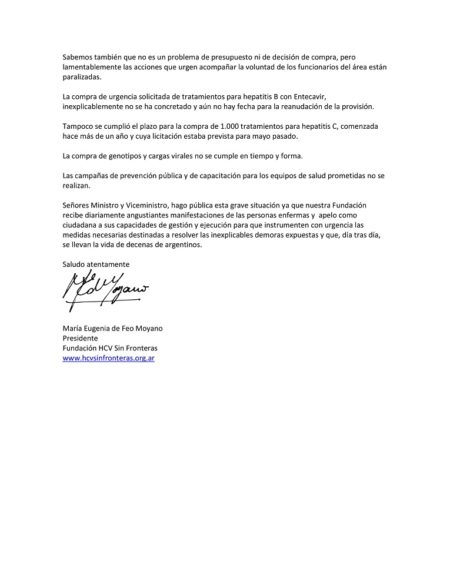 Señores Ministro y Viceministro, hago pública esta grave situación dado que nuestra Fundación recibe diariamente angustiantes manifestaciones de las personas enfermas y apelo como ciudadana a sus capacidades de gestión y ejecución para que instrumenten con urgencia las medidas necesarias destinadas a resolver las inexplicables demoras expuestas y que, día tras día, se llevan la vida de decenas de argentinos.