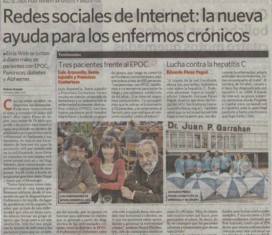 Dejamos a continuación la reproducción de una artículo realizado por Valeria Román de Clarín, a quien agradecemos por la nota, referido a los grupos que trabajamos en las redes sociales informando y apoyando a quienes viven con una enfermedad crónica. La nota incluye un espacio dedicado al trabajo que realizamos desde la Fundación HCV Sin Fronteras contra las hepatitis virales. Reproducimos a continuación el artículo que salió en la versión papel del diario, el día domingo 28 de marzo de 2010.
