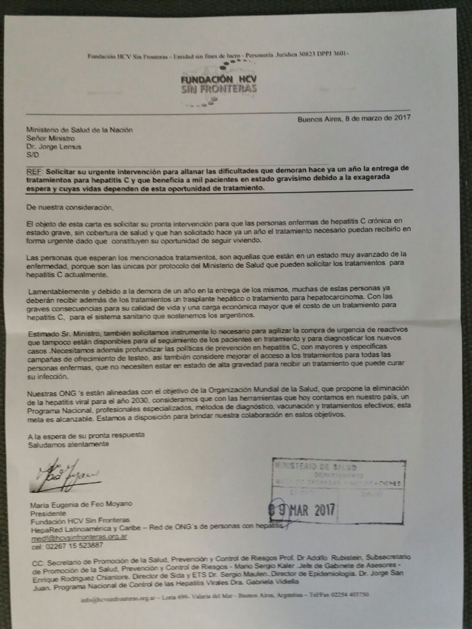 Dado que el Programa de hepatitis, nos ha mencionado que aún no tienen fecha cierta de distribución y ante el agravamiento de la salud de nuestros compañeros, HCV Sin Fronteras ha enviado como primera acción, una carta urgente al Ministro de Salud de la Nación Dr. Jorge Lemus para que resuelva con prioridad esta situación.