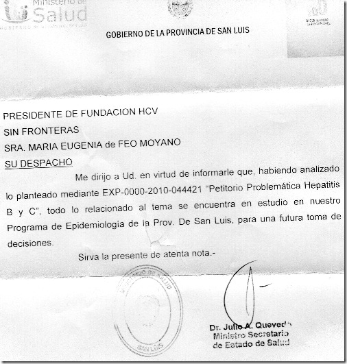 Respuesta sobre hepatitis virales, Ministro de Salud de San Luís